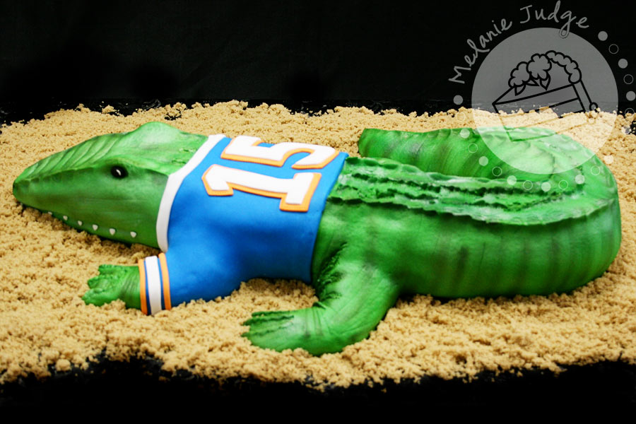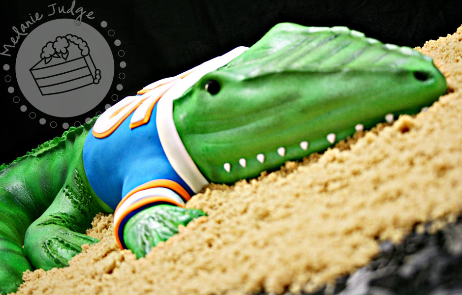 Predictably, the gator was wearing a Tim Tebow jersey (this was a pre-NFL draft cake). The fondant was pinched, pulled, crimped, and scored to add texture, and I airbrushed it in shades of green to add highlights and depth.