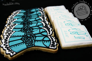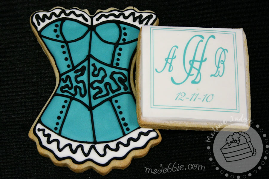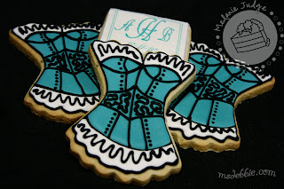 Bustier & Monogram Cookies 3 Comments / By Ph.D-serts & Cakes / July 26, 2010 July 26, 2010 These are cookies we made for a bridal shower. The guests received 1 each of the bustier cookies and the monogram cookies. Both cookies were made with royal icing in teal, white, and black. Love them!