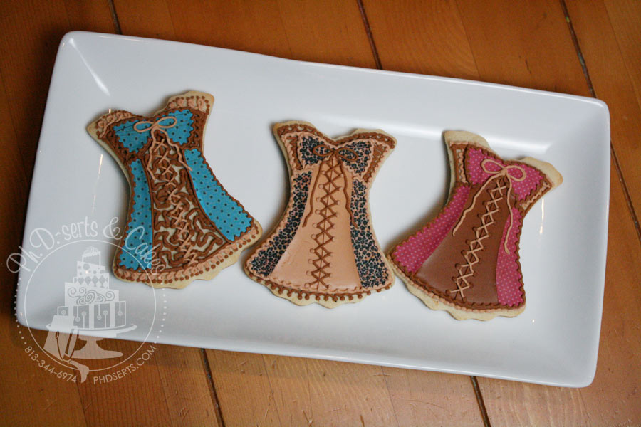 For these bustier cookies, I used blue polka dot, leopard print, and pink polka dot edible prints from my PhotoFrost printing system. The rest of the decorations were done with royal icing.