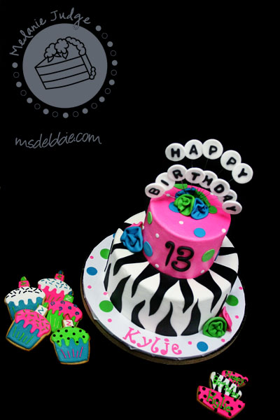 The party colors were blue, hot pink, and lime green!  This cake is a perfect example of a typical 13-year-old’s cake because zebra print, polka dots, and ribbon roses are SO popular!
