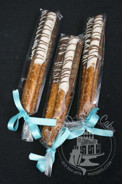 But that’s not all! They also wanted chocolate-dipped pretzel sticks – yum! Each guest received a pretzel dipped in white chocolate, milk chocolate, and dark chocolate. Is your mouth watering? All of a sudden, I’m craving one dipped in dark chocolate…