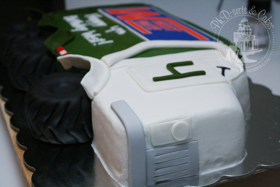 The wheels were made of Rice Krispies Treats covered in fondant, but everything else you see is CAKE! The cake was covered with green or white buttercream and the decorations were done with fondant. And the cake flavor? Vanilla cake with Bavarian cream filling – yum!