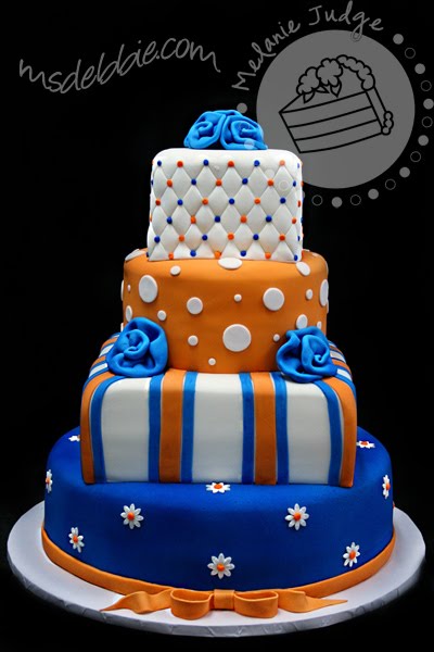 The cake was topped with blue ribbon roses. The top tier was quilted and accented with blue & orange dots at the intersection points. The second tier was decorated with random polka dots.