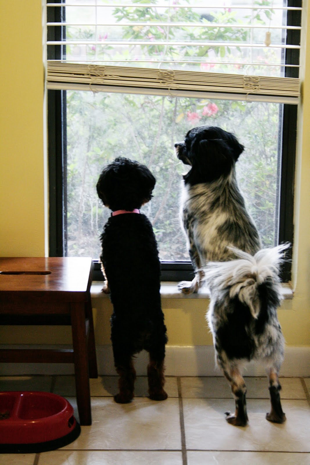 This was during one of our dog-sitting episodes with Bella. The puppies love each other and are pretty much never separated. Nani is always looking out the front window, and one morning I found Bella imitating her friend. Precious.