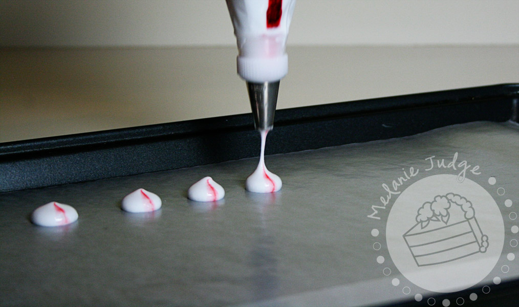 Step 3: Squeeze some of the mixture through the tip into a separate bowl until you see your color stripes beginning to appear. Then begin to pipe polka dots on a cookie sheet lined with wax paper. (Learn from my mistake: Dust your wax paper with confectioner’s sugar. It will be a WHOLE lot easier to remove them when they’re chilled.)