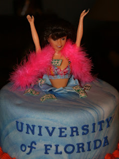 This cake is actually a lot smaller than it looks – only the top tier is cake! The bottom tier is a Styrofoam cake dummy. I thought the cake would look funny if she was jumping out of something that was too small for her to fit in! By using the dummy on the bottom, the cake looks taller and more impressive without adding a lot of time and labor to make the finished product! On the back of the cake, I attached little symbols that were personal to Matt and his family like a VW logo to symbolize his new car, legal balances to symbolize his plans to attend law school, a golf bag to represent one of his favorite recreations, and an Obama campaign logo because Matt recently became a US citizen and voted for Obama.