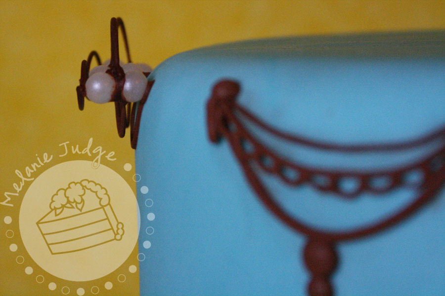 Place a small dot of royal icing at the intersection points of the drop strings. Press a sugar pearl on each royal icing dot. Let these dry completely before continuing. (Sorry, no photos for this step, but you can see the pearls in the next step.)