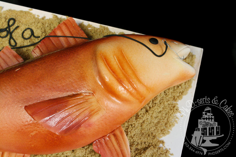 The cake was hand-carved, covered in fondant, and then airbrushed to add the color and detail typical of a Redfish.