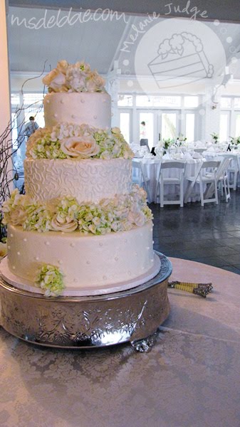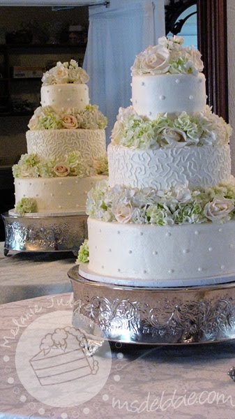 This was the very first wedding cake I decorated for Debbie. The cake was iced in buttercream and decorated with buttercream Swiss dots and cornelli lace. What’s cornelli lace? Check out this tutorial by Wilton.
