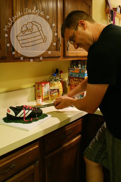 It’s always fun to watch people cut a cake for the first time so here are the pictures of Mike cutting it: